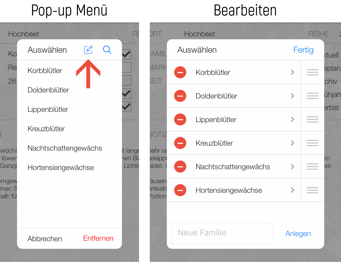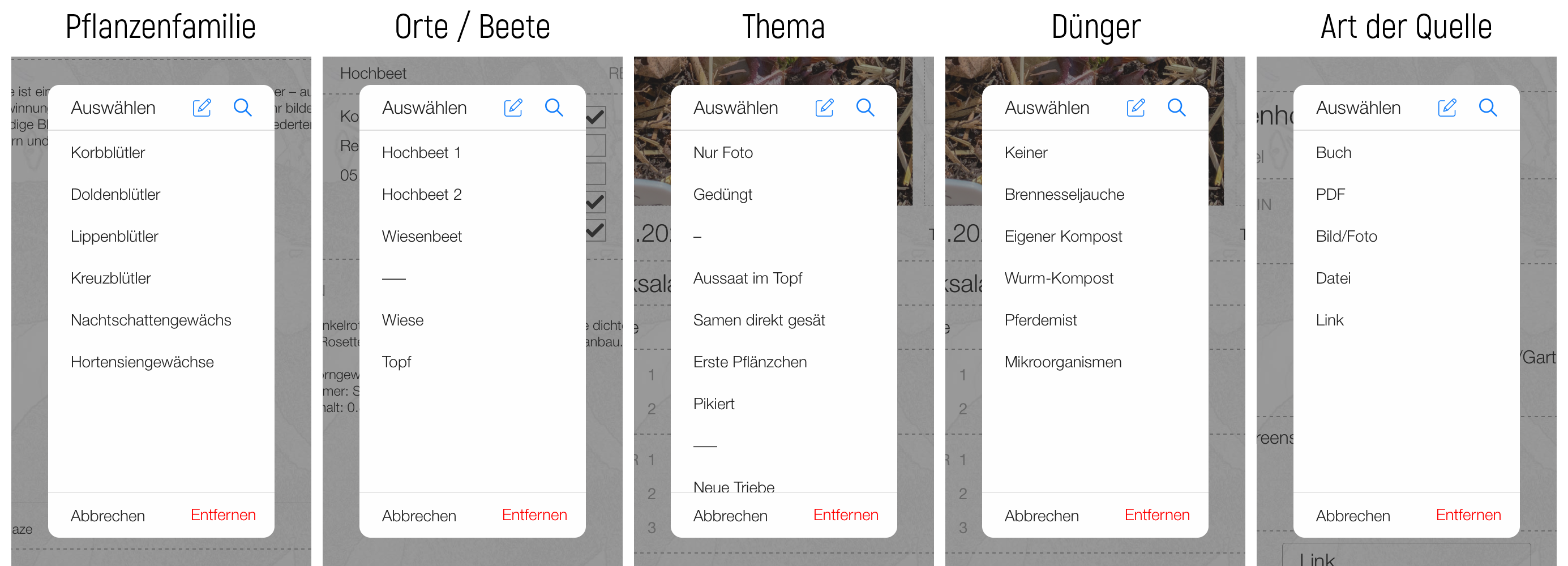 Bei gewissen Eingabefeldern verwendet man immer wieder die selben Begriffe. Zum Beispiel bei der Pflanzen-Familie, den To-dos oder beim Dünger. Um zu vermeiden, dass du immer wieder die selben Worte eintippen musst, öffnet sich ein Pop-up Fenster mit einer Liste bisher angelegter Begriffe. Du kannst sie durch Touch in das entsprechende Feld eintragen. Dabei handelt es sich